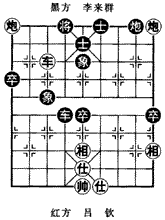 (局例1) 如图,是1994年“百花杯”第四届棋王挑战赛中,广东吕钦对河北李来群酣斗完第48回合时的形势。枰面上,红方车、双炮、仕相全,对黑方车、炮、三卒、士象全。红方车入黑方宫顶线,双炮分别沉入黑方两边底角,相八边陲;黑方车骑河,炮被锁,有双卒过河。现在轮到红方走子,实战着法如下:
