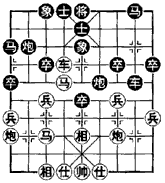 (局例) 如图,是1995年全国团体赛中,上海胡荣华对湖北柳大华弈完第20回合时的形势,由“飞相局对在炮过宫”布局演变而成。枰面上,双方大子均等,士相(象)都全。红方车过河,马骑河,阵形工整;黑方多一过河中卒,但子力分散。现在轮到红方走子,实战着法如下: