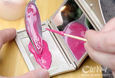 4.待溶液全部溶解后,转移到镜盒上,倒的时候尽量铺满凹槽,然后自然晾干,就变成了新唇色镜盒,比原色浅得多且方便携带。