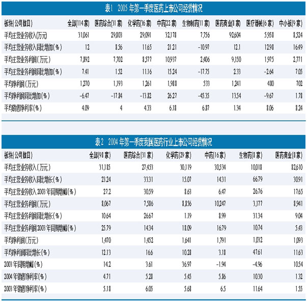 2005年第一季度统计数据显示(表1),剔除马应龙(没有披露2004年第一季度的数据)和重组股三精制药(数据前后不可比),114家医药上市公司平均实现主营业务收入31061万元,同比增长了12%,而2004年和2003年同期98支医药股票的主营业务收入增幅分别为23.24%和27.20%。整体来看,2003年~2005年这三年来第一季度的收入同比增幅趋于下滑态势。