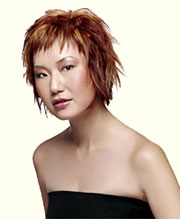 烫发根,使头发变蓬松。全头做层次剪,发尾柔软,后面发型齐长。刘海特别短,可以看到额头,有拉长脸形的效果。