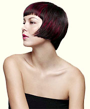 轮廓分明的层次剪,外型类似70年代的齐装(Bob),刘海呈圆弧形,紧贴额头。