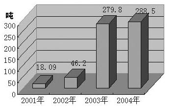 图3:我国2001年~2004年四种他汀类原料药生产产量增长态势
