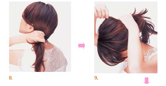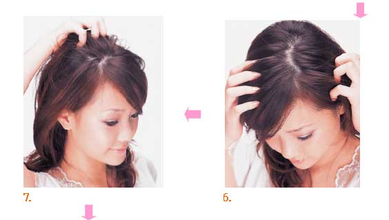 头往后仰,用手握住所有的头发,让后脑勺头发蓬松