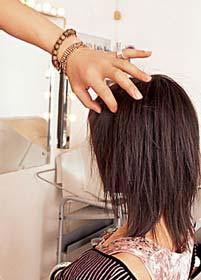 边涂抹造型产品边用双手往上提升似的抓乱项部的头发,隐藏发缝并使头发呈现蓬松感。